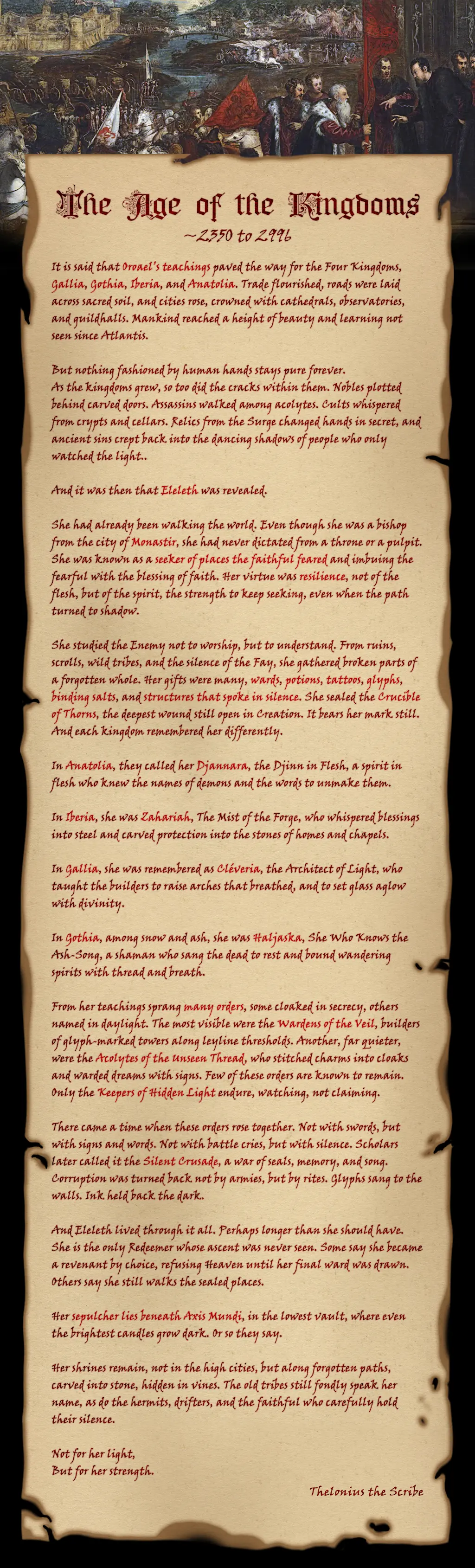 Mówi się, że nauki Oroaela utorowały drogę Czterem Królestwom: Gallii, Gothii, Iberii i Anatolii. Handel kwitł, drogi były wytyczane przez świętą ziemię, a miasta wznosiły się, zwieńczone katedrami, obserwatoriami i cechowniami. Ludzkość osiągnęła szczyt piękna i wiedzy, jakiego nie widziano od czasów Atlantydy.