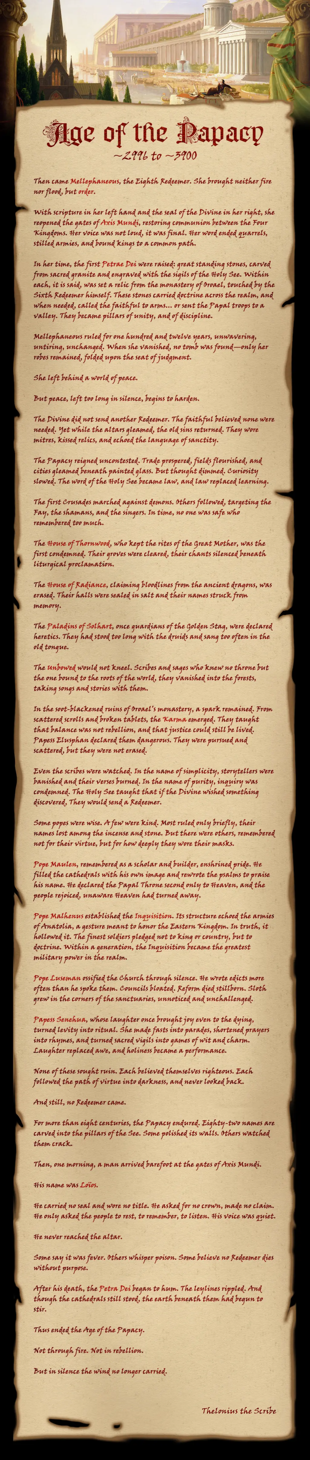 Za jej panowania powstały pierwsze Petrae Dei: wielkie stojące kamienie, wyrzeźbione ze świętego granitu i wyryte znakami Świętego Stolicy Apostolskiej. W każdym z nich, jak głoszono, umieszczono relikwię z klasztoru Oroael, dotkniętą przez samego Szóstego Odkupiciela. Te kamienie niosły doktrynę przez cały świat, a gdy było trzeba, wzywały wiernych do walki… lub wysyłały papieskie wojska do doliny. Stały się filarami jedności i dyscypliny.